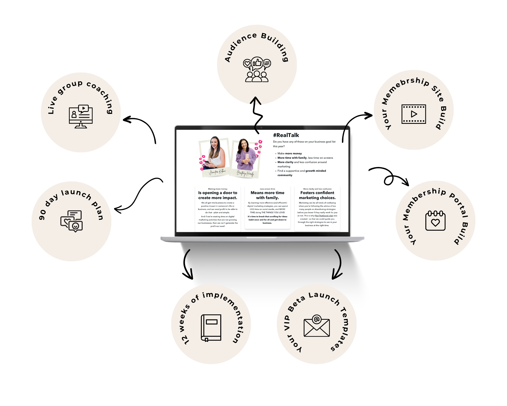 Unlike other programs, we can guarantee that you will walk away with your membership launch during the first 90 days. Why? Because we are building it alongside and FOR you! We don't leave you hanging in the dust to figure it out on your own. This means in addition to the training for each phase, we are building your membership site and community area, and we are building your audience lead ads - this is the one piece that is missing from most other programs and we have added it so that it's impossible NOT to launch if you stick with us for the whole 12 weeks ;)